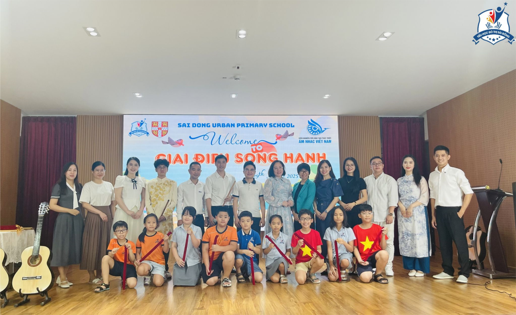 Sáng ngày 29/8/2025, Hội trường Trường Tiểu học Đô thị Sài Đồng rộn ràng trong một không gian đầy âm thanh và cảm xúc khi chương trình giáo dục trải nghiệm âm nhạc với chủ đề “Âm nhạc diệu kỳ từ sáo trúc và guitar” được tổ chức. Đây là hoạt động do Tổ Âm nhạc của nhà trường phối hợp cùng Viện Nghiên cứu Đào tạo Phát triển Âm nhạc Việt Nam thực hiện, với sự tham gia của gần 170 học sinh khối 3, 4, 5.