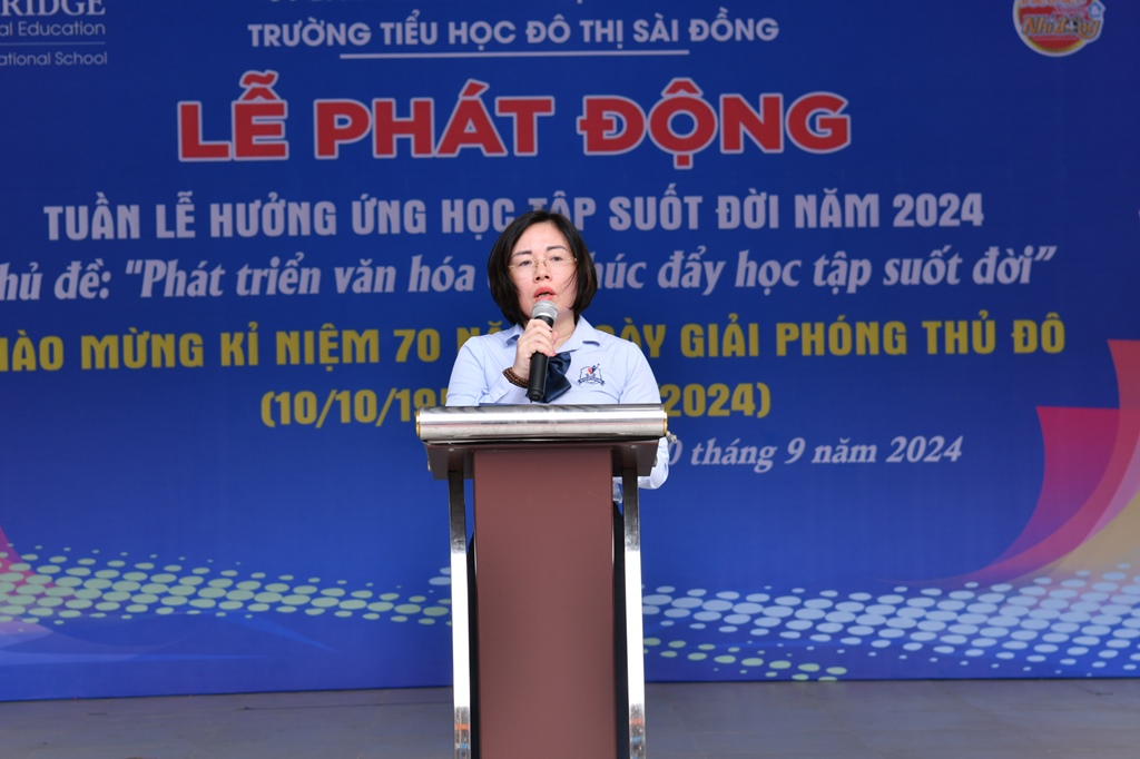 Phát biểu tại buổi lễ, nhà giáo Lê Thị Thu Hường chia sẻ: "Tuần lễ hưởng ứng học tập suốt đời năm 2024 có chủ đề "Phát triển văn hóa đọc thúc đẩy học tập suốt đời". Đây là chủ đề rất ý nghĩa, không chỉ nâng cao nhận thức về tầm quan trọng của đọc sách mà còn khuyến khích mỗi người trong chúng ta cùng nhau xây dựng thói quen học tập, khám phá tri thức và phát triển bản thân. Đọc sách giúp chúng ta mở rộng tầm nhìn, khám phá thế giới xung quanh và phát triển tư duy sáng tạo. Qua từng trang sách, cô tin rằng, các em sẽ được gặp gỡ nhân vật thú vị, trải nghiệm những cuộc phiêu lưu kỳ diệu và học hỏi những bài học quý giá về cuộc sống".
