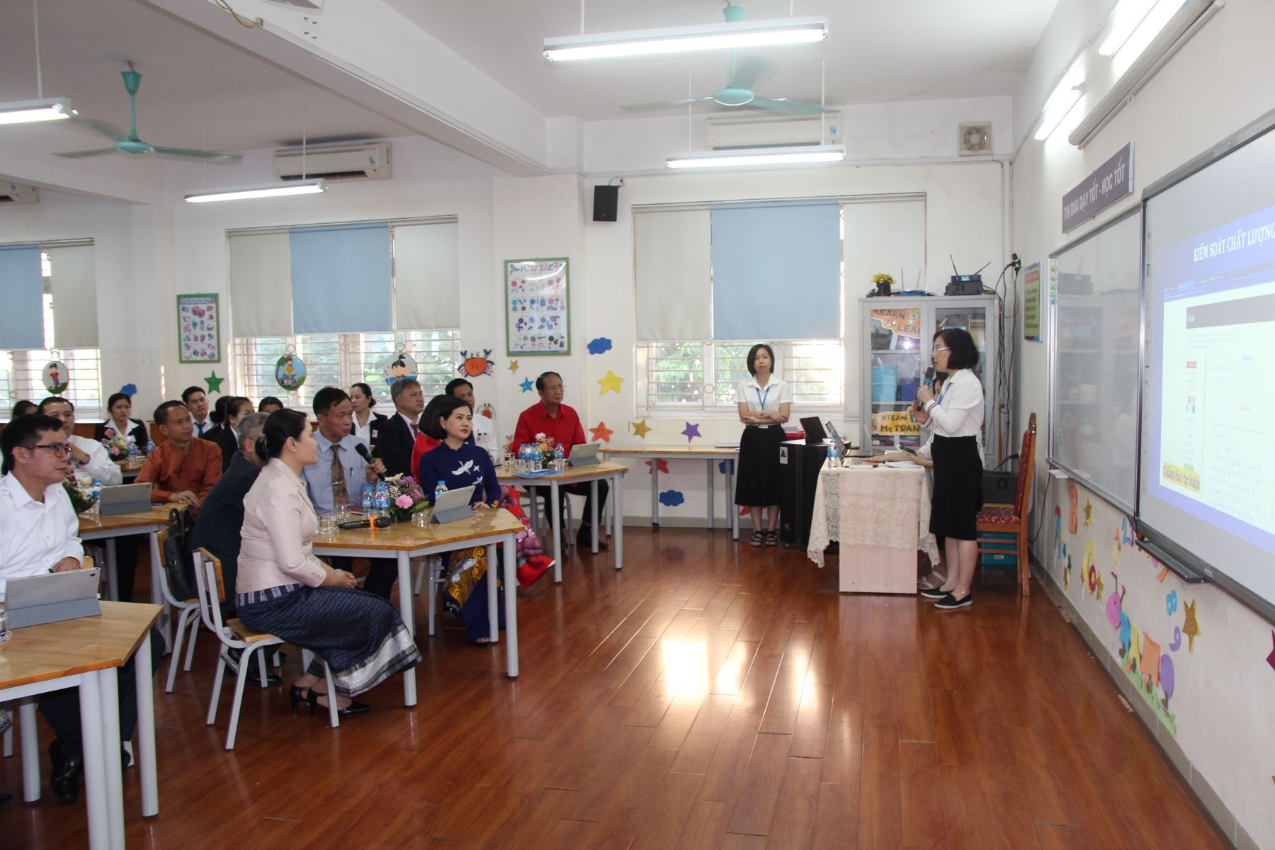 Đoàn cán bộ, giảng viên Trường Chính trị - Hành chính Thủ đô Viêng Chăn và cán bộ TP Hà Nội, UBND quận Long Biên trong chuyến thăm và nghiên cứu thực tế tại Trường Tiểu học đô thị Sài Đồng.