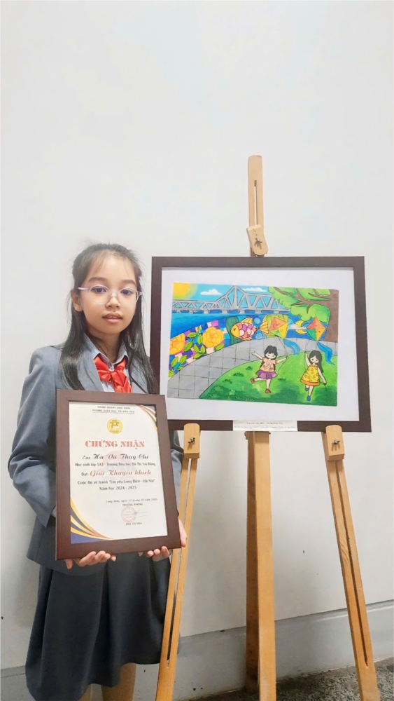 Vừa qua, cuộc thi vẽ tranh "Em yêu Long Biên - Hà Nội" đã diễn ra sôi nổi, thu hút đông đảo học sinh đang theo học tại các trường Tiểu học trong Quận Long Biên tham gia với những tác phẩm đầy sáng tạo và ý nghĩa. Trong đó, em Hà Vũ Thùy Chi, học sinh lớp 5A3, Trường Tiểu học Đô Thị Sài Đồng đã đạt giải Khuyến khích với bức tranh ấn tượng về vẻ đẹp của quận Long Biên.