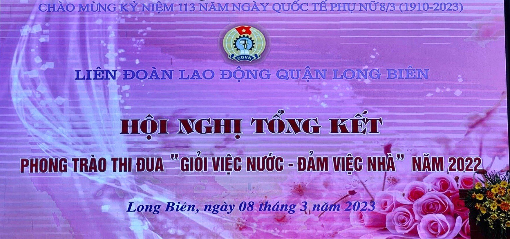 Ngày 8/3/2023 liên đoàn lao động quận Long Biên tổ chức gặp mặt kỷ niệm 113 năm ngày Quốc tế phụ nữ 8 – 3 và 1983 năm khởi nghĩa Hai Bà Trưng - Tổng kết phong trào thi đua “ Giỏi việc nước – Đảm việc nhà” năm 2022.