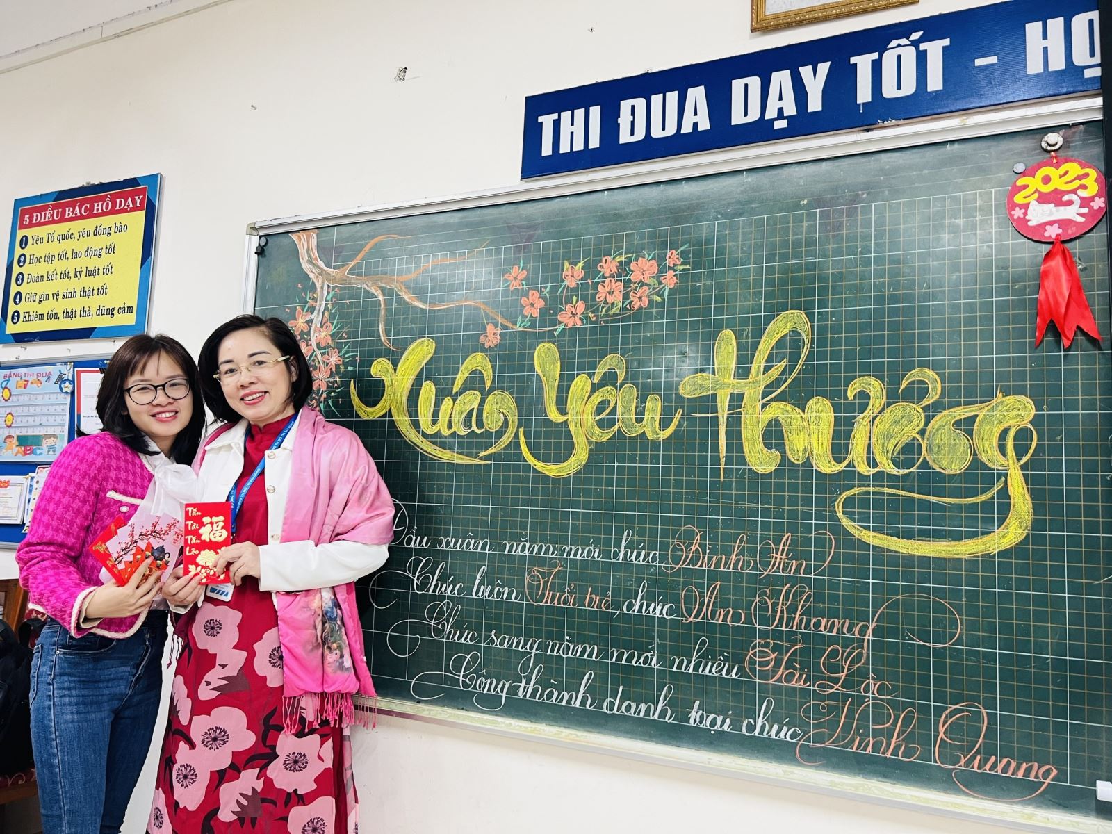 Các thầy cô giáo trong Ban giám hiệu, ban thiếu nhi nhà trường đã đến từng lớp chúc Tết và dành tặng những phong bao lì xì may mắn tới cô giáo và học sinh các lớp, chúc toàn thể các thầy cô giáo và các con học sinh năm mới Quý Mão 2023 sức khỏe, bình an, hoàn thành xuất sắc nhiệm vụ dạy và học. Tất cả học sinh toàn trường đã “mở hàng” đầu năm bằng những bài học mang đầy hơi thở xuân. Những trích đoạn thơ văn hay như “Chúc Tết” hay “Khai bút đầu năm” đã tưng bừng được các thầy cô gửi tới các con mở đầu cho tiết học đầu năm mới.