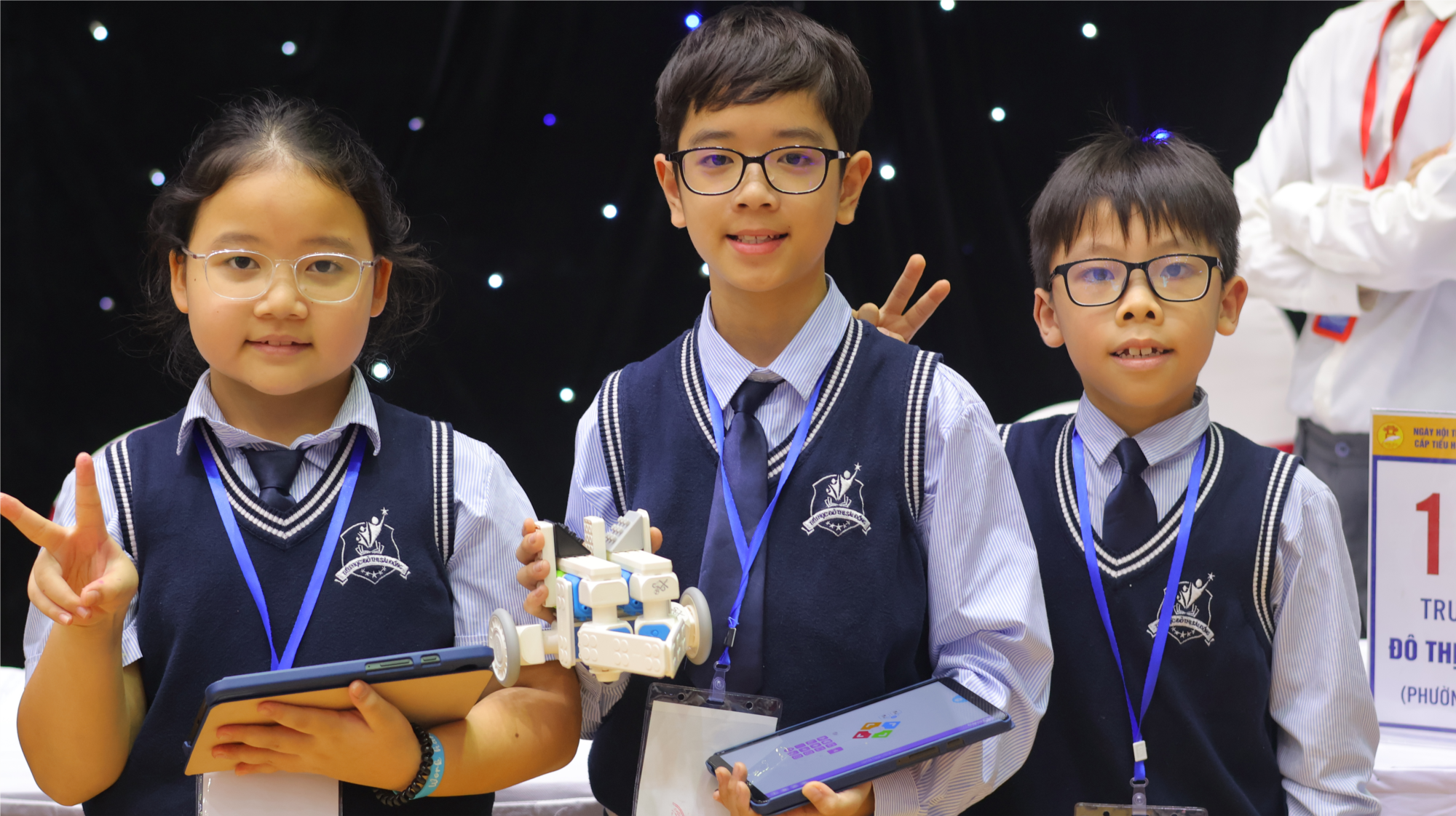 Đội thi gồm ba học sinh đại diện cho ba khối lớp 3, 4 và 5: em Lê Anh Vũ (lớp 3A1), em Nguyễn Minh Hà (lớp 4A5) và em Hà Minh Hải (lớp 5A6). Đây đều là những gương mặt tiêu biểu, giàu năng lực và tự tin trong các hoạt động tiếng Anh kết hợp STEM Robotics. Đồng hành cùng các em là hai giáo viên phụ trách trực tiếp: cô giáo Đào Vân Trang, cô giáo Nguyễn Thị Trang, cùng sự hỗ trợ chuyên môn và động viên tinh thần của các giáo viên chủ nhiệm, tổ chuyên môn, nhà trường và gia đình, tạo nên nền tảng vững chắc để đội thi bước vào sân chơi với tâm thế tốt nhất.