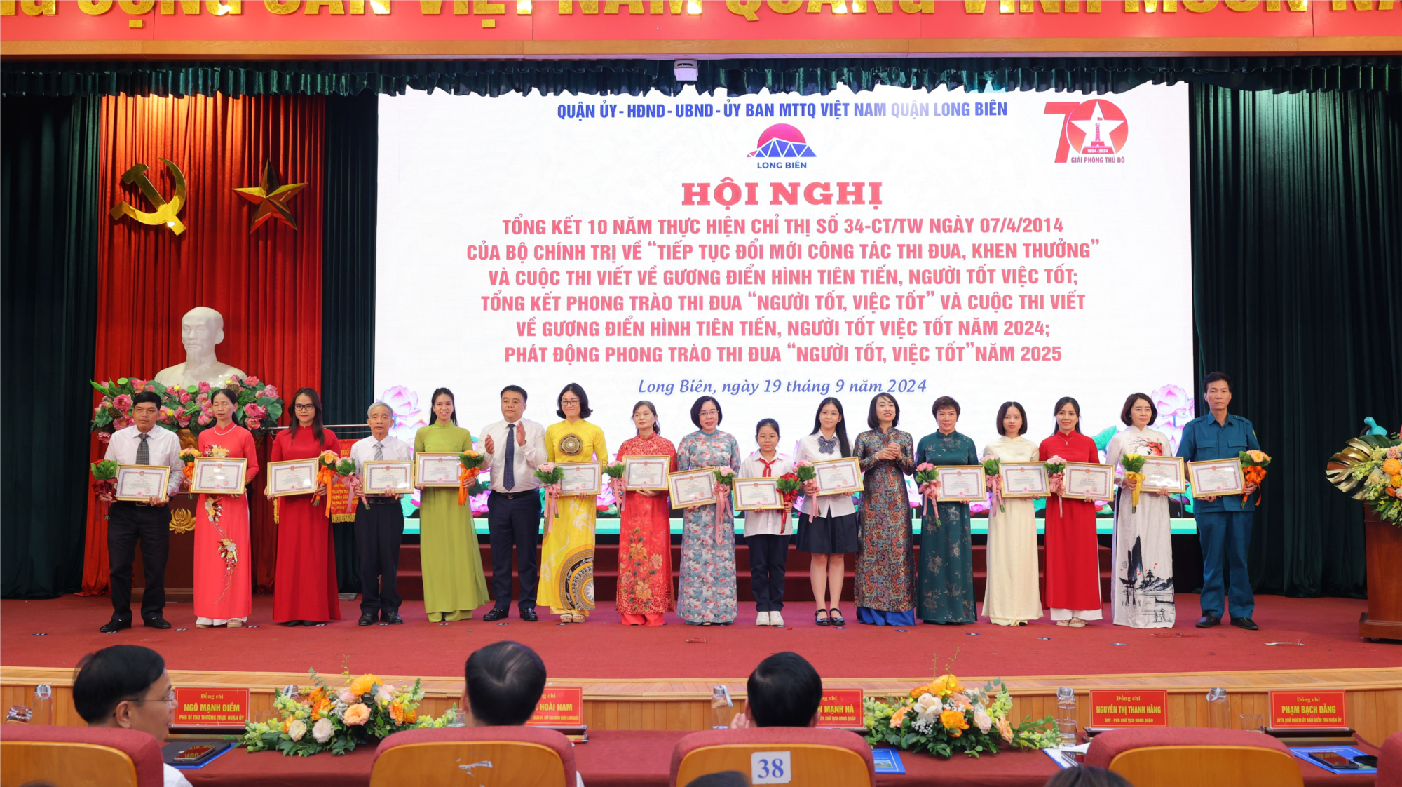 Cô hiệu trưởng Lê Thị Thu Hường ( đứng thứ 9, từ trái sang) nhận giấy khen tại Hội nghị tổng kết 10 năm thực hiện chỉ thị số 34-CT/TW ngày 07/4/2014 của Bộ chính trị về “ Tiếp tục đổi mới công tác thi đua, khen thưởng” và cuộc thi viết về gương điển hình tiên tiến, người tốt việc tốt; Tổng kết phong trào thi đua “ Người tốt, việc tốt” và cuộc thi viết về gương điển hình tiên tiến, người tốt việc tốt năm 2024; Phát động phong trào thi đua “ Người tốt, việc tốt” năm 2025.