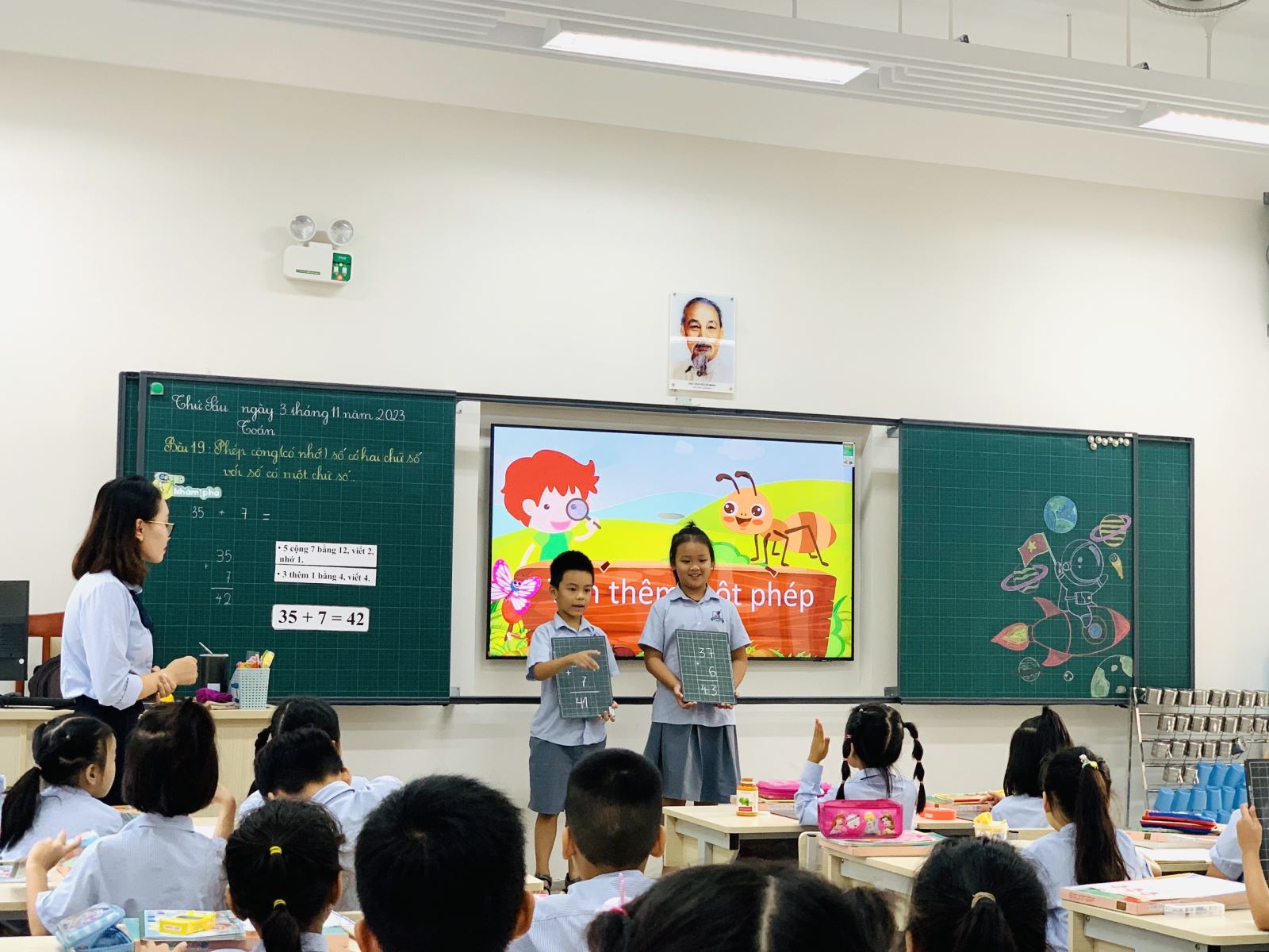 Cô giáo Vũ Mai Trâm – một giáo viên có tuổi đời và tuổi nghề còn rất trẻ nhưng đam mê, hăng say nghiên cứu bài học để có một tiết Toán mà học sinh tham gia sôi nổi các hoạt động tìm hiểu bài, giáo viên có cách dẫn dắt các hoạt động bằng clip hoạt hình hợp lí, kích thích sự tập trung của các bạn nhỏ.