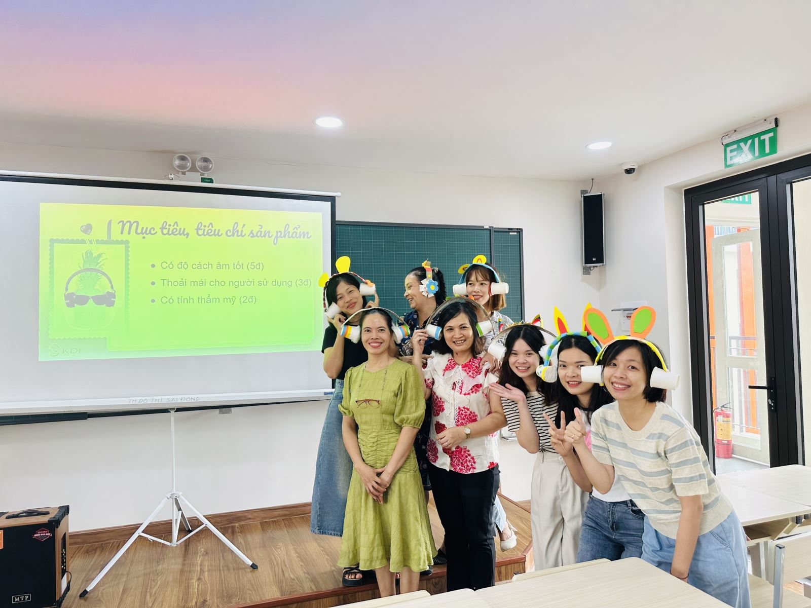 Tiếp theo các học viên cùng trải nghiệm 1 tiết học Khoa học lớp 4 “Tai nghe chống ồn”. Giáo viên được chia thành các nhóm tham gia tiết học với vai trò là các học sinh. Các nhóm sổi nổi thảo luận bài học và thực hành chế tạo tai nghe chống ồn.