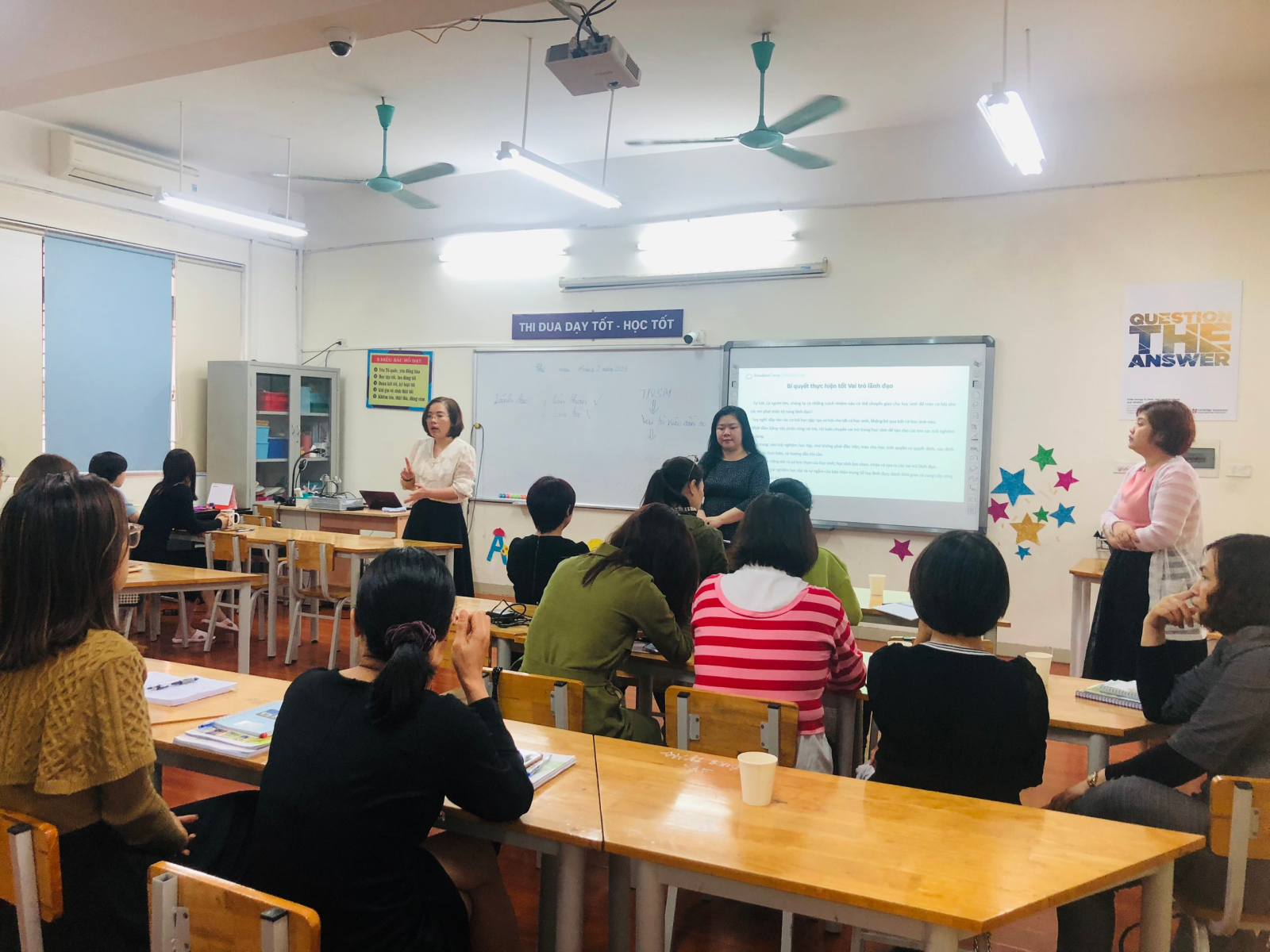 Hình 1: Các thầy cô giáo vui tươi, hào hứng với hoạt động khởi động đầu giờ.