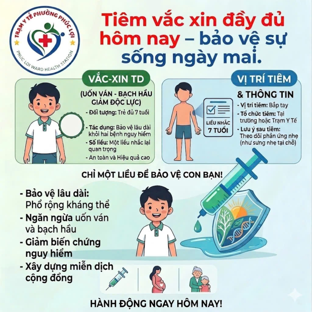 Trạm Y tế phường Phúc Lợi tổ chức tiêm chủng vắc xin Td cho học sinh đủ 7 tuổi tháng 4/2026. Trạm Y tế trân trọng kính mời phụ huynh đưa con đi tiêm chủng, góp phần bảo vệ sức khỏe cho bản thân, gia đình và cộng đồng.