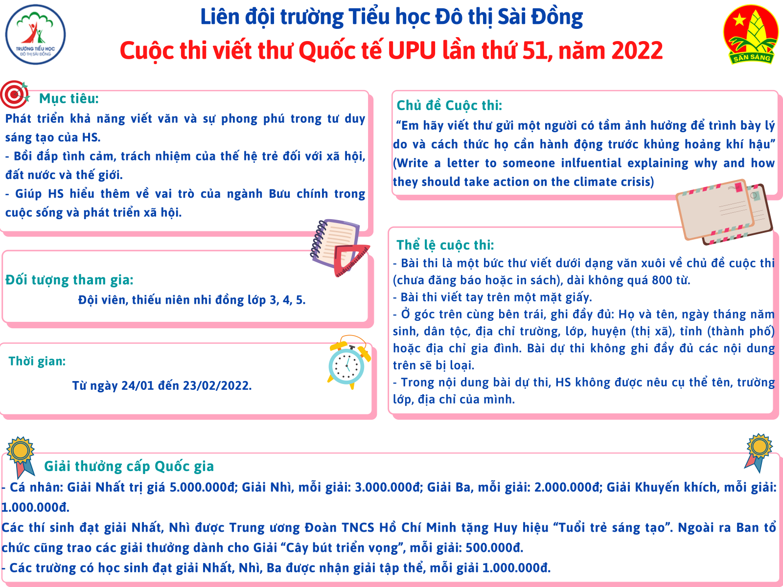 Căn cứ công văn số 5144-CV/TĐTN-CNTN ngày 12/01/2022 của Thành Đoàn Hà Nội về việc “Triển khai cuộc thi viết thư Quốc tế UPU lần thứ 51, năm 2022”; Công văn số 107-CV/HĐĐ ngày 13/01/2022 của Hội đồng đội quận Long Biên về việc “Triển khai cuộc thi viết thư Quốc tế UPU lần thứ 51, năm 2022”; Ban Thiếu nhi trường TH Đô thị Sài Đồng phát động “Cuộc thi viết thư Quốc tế UPU lần thứ 51, năm 2022” đến các bạn học sinh trong Liên đội.