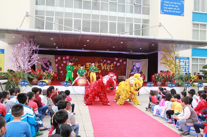 Ngày hội đến trong muôn ngàn hương sắc. Hương thơm của cỏ cây, hoa lá; của miếng bánh giò, bánh tép, kẹo lạc quyện trong vị ngát của chén trà mạn, ly nước trái cây. Sắc đỏ hoa vàng trên chiếc váy xinh của mấy em học trò, súng sính áo mớ ba mớ bảy của mấy bác PH tham gia bán hàng quê, tiếng cười đùa, tiếng reo hò tham gia các trò chơi dân gian đã làm nên một ngày hội tưng bừng và náo nhiệt. Đâu đó, mấy em nhỏ vẫn mải mê với bóng bay nghệ thuật, ngắm nghía nét chữ thư pháp như rồng bay phượng múa. Ai ai cũng rạng rỡ, hồ hởi du xuân trong tiếng nhạc, tiếng sạp lạch cạch.