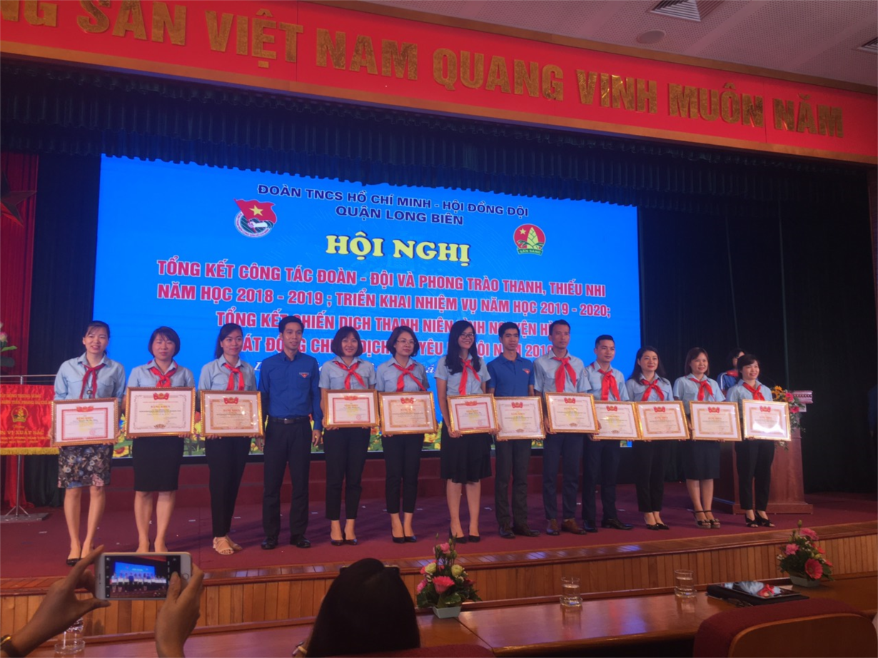 Nhân dịp này, Lãnh đạo Thành phố, Quận ủy đã trao 02 Cờ, 21 bằng khen của Trung ương Đoàn, Hội đồng Đội Trung ương; 02 cờ, 19 bằng khen của Hội đồng đội Thành phố cho các tập thể, cá nhân có thành tích xuất sắc trong Công tác Đoàn – Đội và phong trào thanh thiếu nhi năm học 2018 - 2019; BTV Quận đoàn Long Biên tặng Giấy khen cho 168 tập thể và 89 cá nhân có thành tích xuất sắc trong Công tác Đoàn – Đội và phong trào thanh thiếu nhi năm học 2018 - 2019; 15 mô hình, đội hình và 06 cá nhân tiêu biểu trong Chiến dịch Thanh niên tình nguyện hè năm 2019.