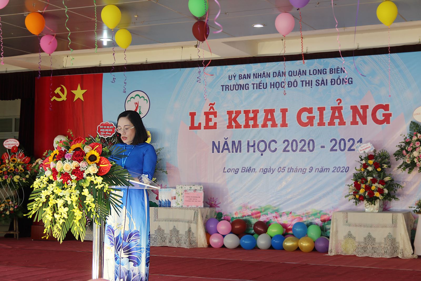 Cô giáo Lê Thị Thu Hường – Bí thư Chi bộ, Hiệu trưởng nhà trường lên phát biểu chào mừng và tuyên bố khai giảng năm học 2020-2021. Trong lời phát biểu, cô giáo Lê Thị Thu Hường nhấn mạnh đây là năm học đặc biệt, thầy và trò phải đối mặt với nhiều khó khăn do đại dịch Covid-19. "Có thể cũng giống như năm học trước, bên cạnh việc tích cực phòng chống dịch bệnh, có những thời điểm, các con sẽ lại học trực tuyến, học online, nhưng với phương châm “ tạm dừng đến trường nhưng không ngừng học”, cô tin tưởng các con sẽ thực hiện tốt kế hoạch học tập và phát triển bản thân, xứng đáng là học sinh trường TH Đô thị Sài Đồng. "- Cô giáo Hiệu trưởng nhà trường bày tỏ sự tin tưởng và quyết tâm. Năm học mới, nhà trường tiếp tục đề ra mục tiêu vừa triển khai các nhiệm vụ, kế hoạch bảo đảm chất lượng giáo dục và công tác dịch vụ của năm học, vừa bảo đảm thực hiện hiệu quả các giải pháp phòng, chống dịch theo chỉ đạo của các cấp quản lí.