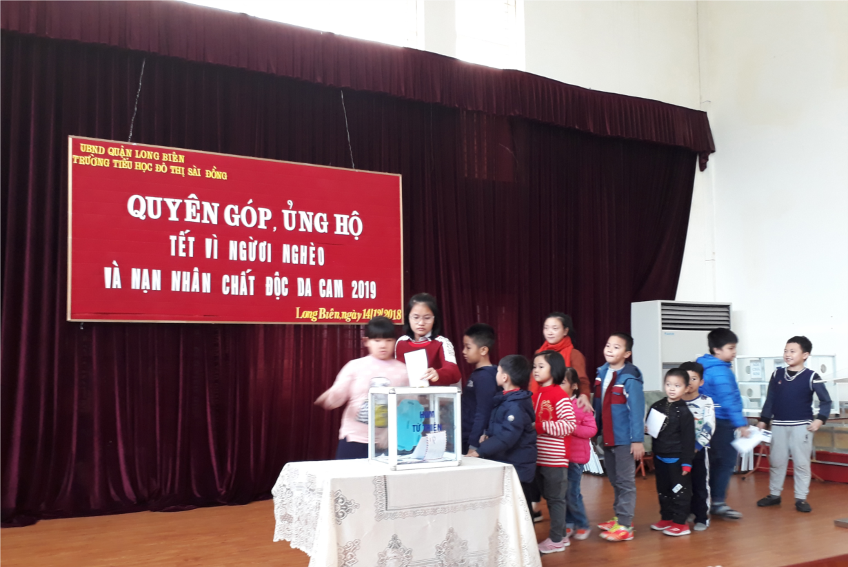 Hưởng ứng phong trào phát động quyên góp, ủng hộ, Trường Tiểu học Đô thị Sài Đồng đã tổ chức 2 buổi quyên góp tập trung cho CB, GV, NV và học sinh toàn trường bắt đầu từ ngày 14/12/2018. Đây là một hoạt động có ý nghĩa trong công tác giáo dục lòng nhân ái cho học sinh, cùng chia sẻ giúp đỡ những người nghèo, những nạn nhân chất độc màu da cam có một cái tết đầy đủ hơn.