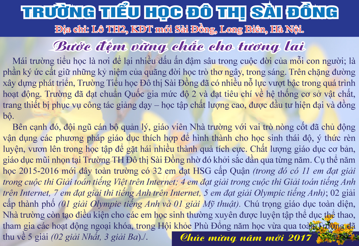 Bên cạnh đó, đội ngũ cán bộ quản lý, giáo viên nhà trường với vai trò nòng cốt đã chủ động vận dụng các phương pháp giáo dục thích hợp để hình thành cho học sinh thái độ, ý thức rèn luyện, vươn lên trong học tập để gặt hái nhiều thành quả tích cực. Chất lượng giáo dục cơ bản, giáo dục mũi nhọn tại trường TH Đô thị Sài Đồng nhờ đó khởi sắc dần quan từng năm. Cụ thể, năm học 2015- 2016 mới đây toàn trường có 32 em đạt HSG cấp Quận ( trong đó có 11 em đạt giải trong cuộc thi Giải toán tiếng Việt trên Internet, 04 em đạt giải trong cuộc thi Giải toán tiếng Anh trên Internet, 07 em đạt Giải thi tiếng Anh trên Internet, 05 em đạt Giải Olympic tiếng Anh); 02 giải cấp Thành phố ( 01 giải Olympic Tiếng anh và 01 giải Mĩ thuật). Chú trọng giáo dục toàn diện, nhà trường còn tạo điều kiện cho các em học sinh thường xuyên được luyện tập thể dục thể thao, tham gia các hoạt động ngoại khoá, trong Hội khoẻ Phù Đổng năm học vừa qua toàn trường đã thu về 05 giải ( 02 giải Nhất, 03 giải Ba).
