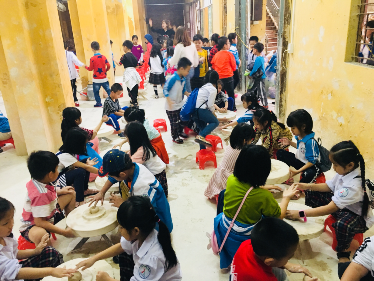 Ghé thăm những xưởng gốm trong làng, các con được giới thiệu về các công đoạn làm ra sản phẩm như thế nào. Trước sự tài tình, khéo léo, tỉ mỉ của các nghệ nhân trong nghề với bàn tay điêu luyện đã biến nắm đất thành tác phẩm nghệ thuật đẹp mắt và sinh động.