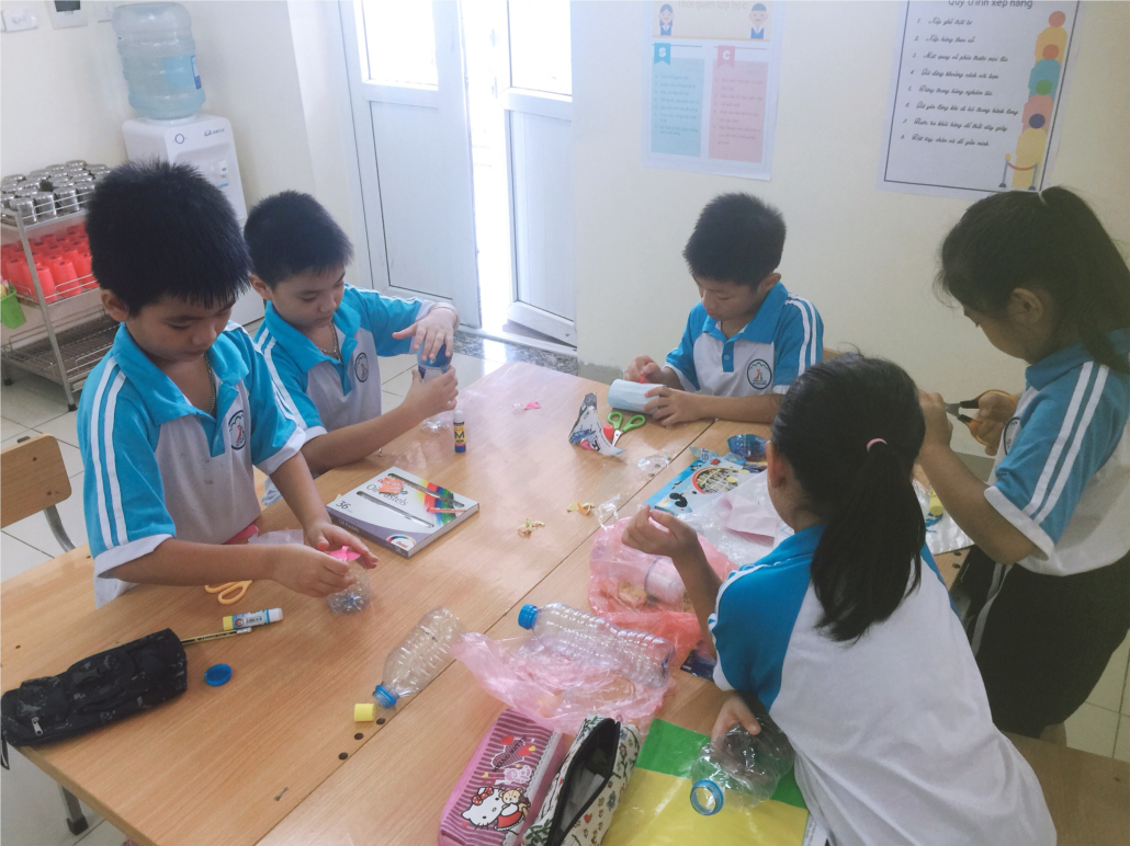 Hình ảnh: Các con trải nghiệm làm sản phẩm tái chế