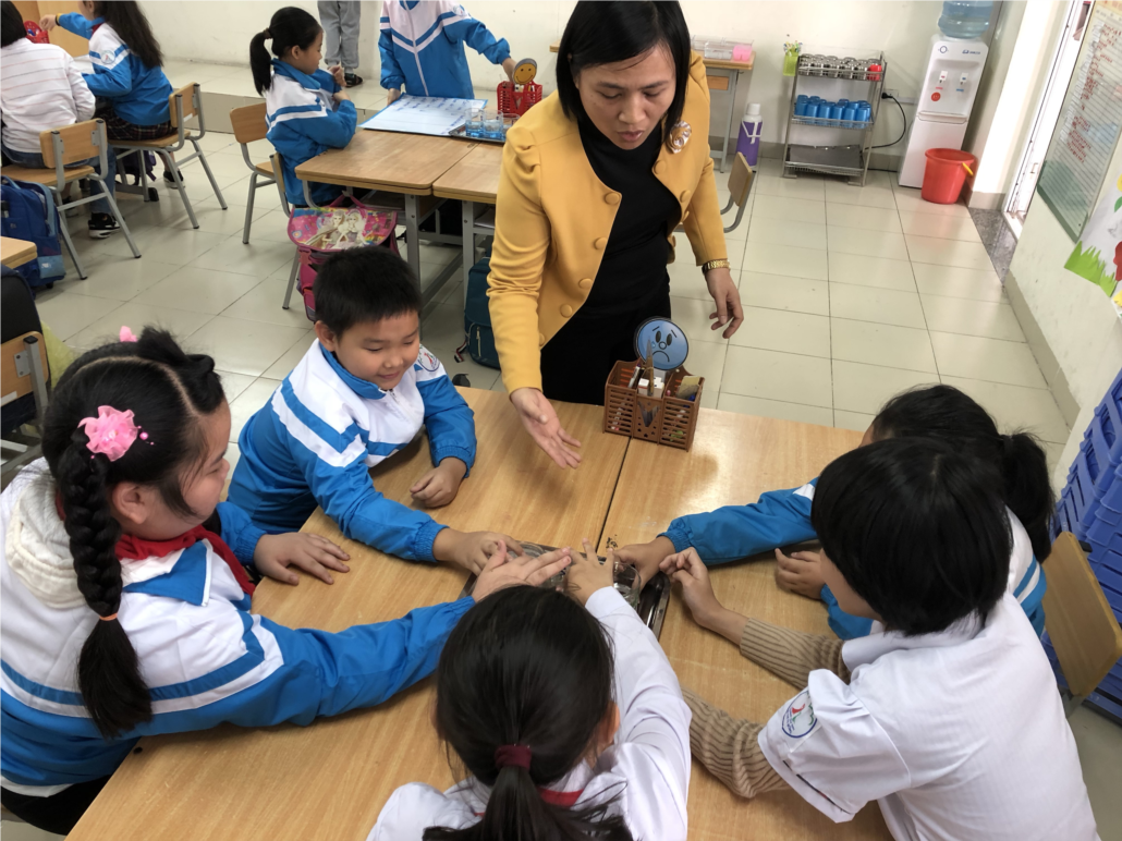 Hình ảnh: Cô giáo Nguyễn Thị Thanh Hòa hướng dẫn học sinh thực hành thí nghiệm trong bài học " Nóng, lạnh và nhiệt độ"