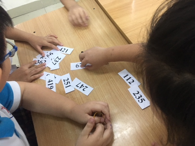 To help students to be interested in reading the 3-digit numbers, the teacher organized the game to find bigger and smaller numbers than the teacher’s numbers. The students are very excited and ready to participate in this game. Everybody can read numbers from 100 to 999 corectly.