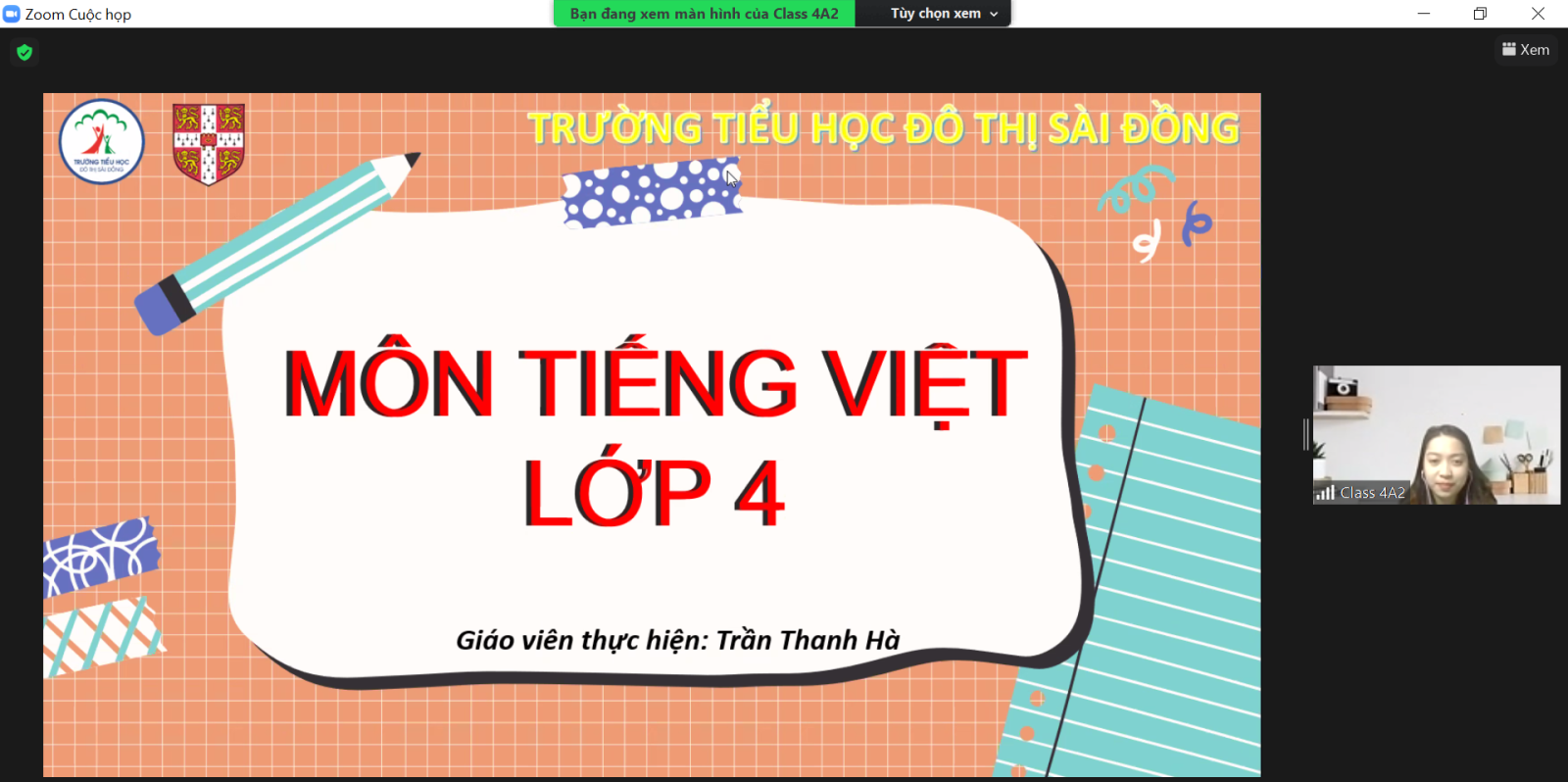 Cô giáo Trần Thanh Hà, giáo viên chủ nhiệm lớp 4A2, đã lựa chọn môn Tiếng Việt cho tiết giáo viên giỏi của mình với bài 6A: Dũng cảm nhận lỗi (tiết 2). Trong tiết dạy, cô giáo tổ chức các hoạt động dạy và học với các hình thức, phương pháp và kỹ thuật dạy học tích cực phù hợp hình thức dạy học online giúp cho học sinh tự khám phá, luyện tập, vận dụng kiến thức một cách tích cực và chủ động.