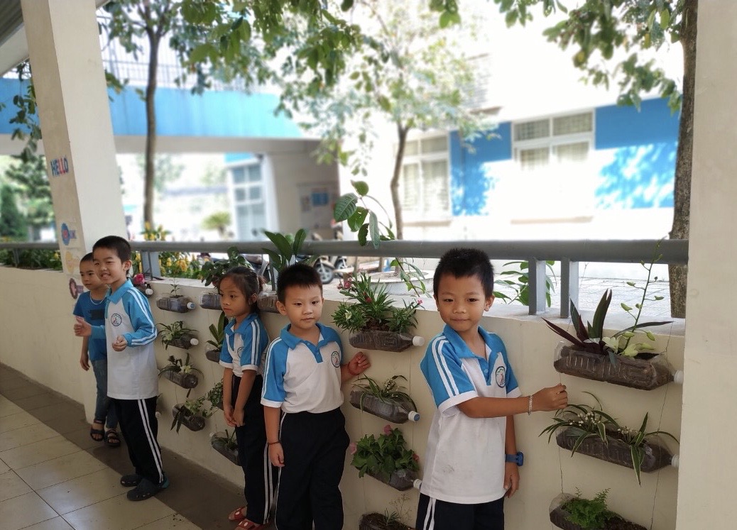 Không gian xanh mát trước cửa lớp học góp phần làm đẹp thêm khung cảnh sư phạm nhà trường. Đồng thời, nhắc nhở các em học sinh luôn chăm sóc cây, biết sử dụng tiết kiệm, hạn chế và tái sử dụng chất thải nhựa một cách hợp lý.