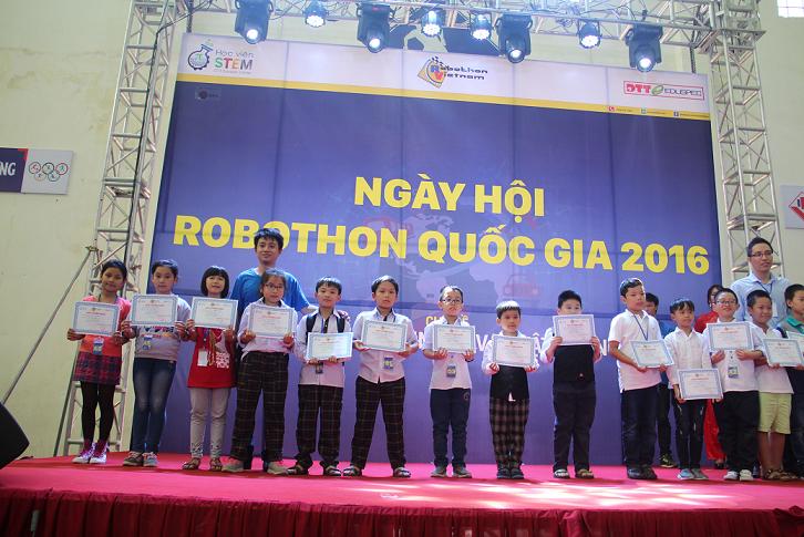 Hình ảnh: Các em học sinh đội Sơ cấp nhận giải Ba Robothon quốc gia 2016
