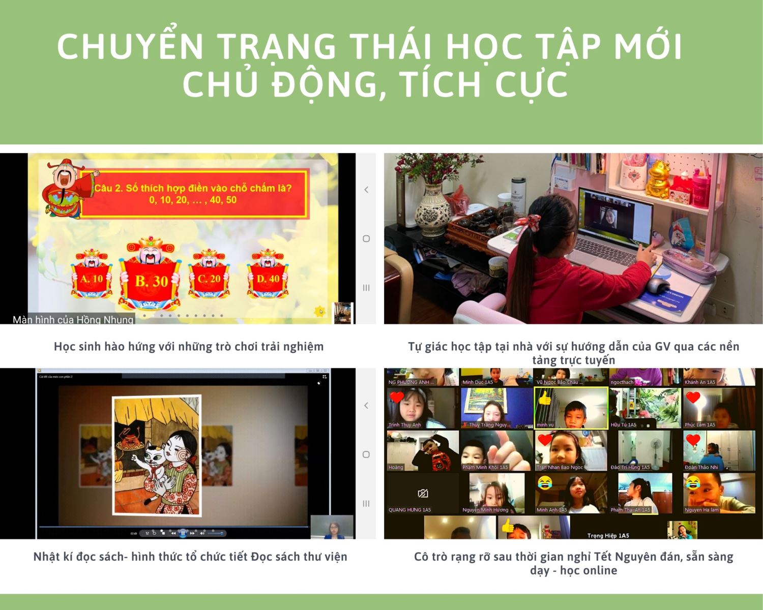 Nhiều giải pháp dạy học trực tuyến đã được nhà trường triển khai bên cạnh lớp học trực tuyến trên Zoom như xây dựng video bài giảng cùng hệ thống câu hỏi, bài tập Quizizz, Google Forms gửi cho phụ huynh học sinh bằng các đường link qua Zalo chung của từng lớp, nhận bài làm của học sinh qua mail; kết hợp học trên trang web học trực tuyến OLM.VN với dạy trực tiếp qua Zoom để kịp thời giải đáp các thắc mắc của học sinh.