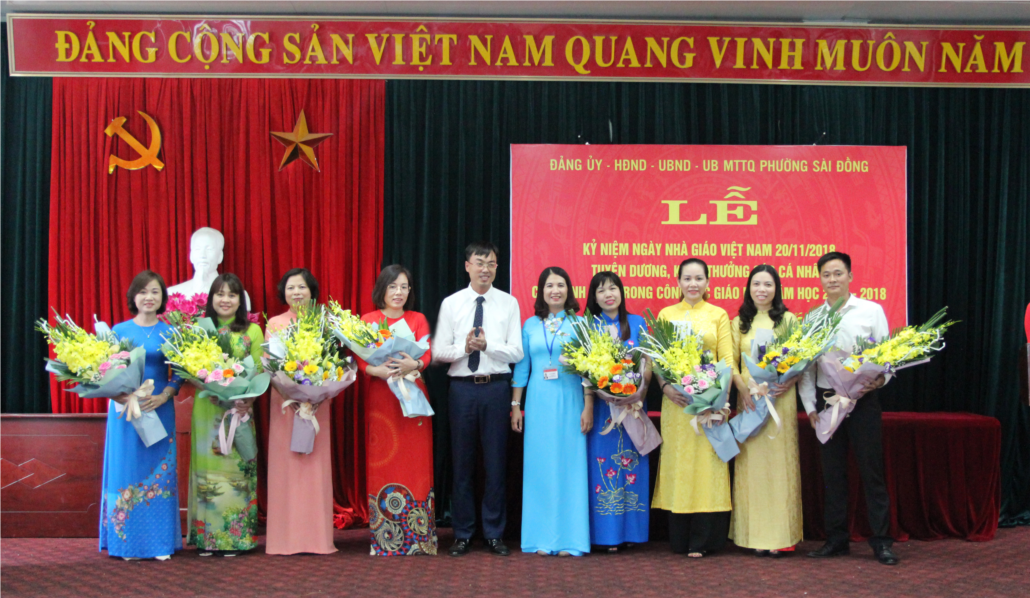 Tại buổi lễ, cô giáo Lê Thị Thu Hường - Hiệu trưởng, Vũ Thị Hoa Mơ - Phó Hiệu trưởng, Nguyễn Thị Huyền Trang – giáo viên và đồng chí Trần Anh Minh nhân viên IT vinh dự là những cá nhân tiêu biểu được nhận giấy khen của UBND phường Sài Đồng về những đóng góp trong công tác giáo dục trong năm học 2017 - 2018.