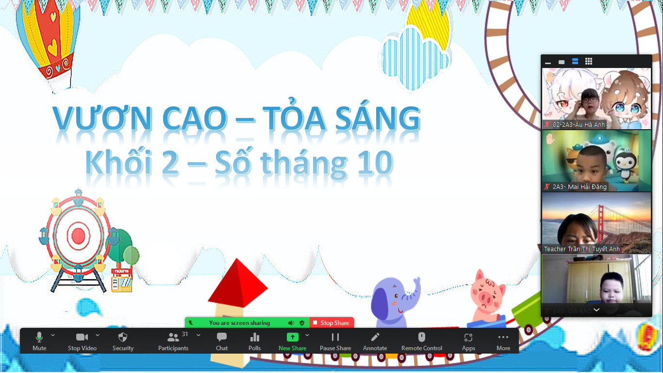 Nhằm nâng cao chất lượng dạy- học online và tạo hứng thú cho học sinh trong quá trình học tập, nhà trường đã tổ chức sân chơi “Vươn cao- tỏa sáng” cho học sinh các lớp. Học sinh khối 2 cũng tham gia sôi nổi. Các con học sinh bước vào cuộc thi bằng cách chinh phục ba vòng thi đó là Chinh phục mật mã, Vươn cao, Tỏa sáng.